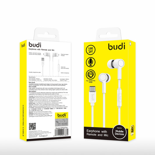 Budi Type-C Earphones with Remote and Mic (1.2m) - Black & White