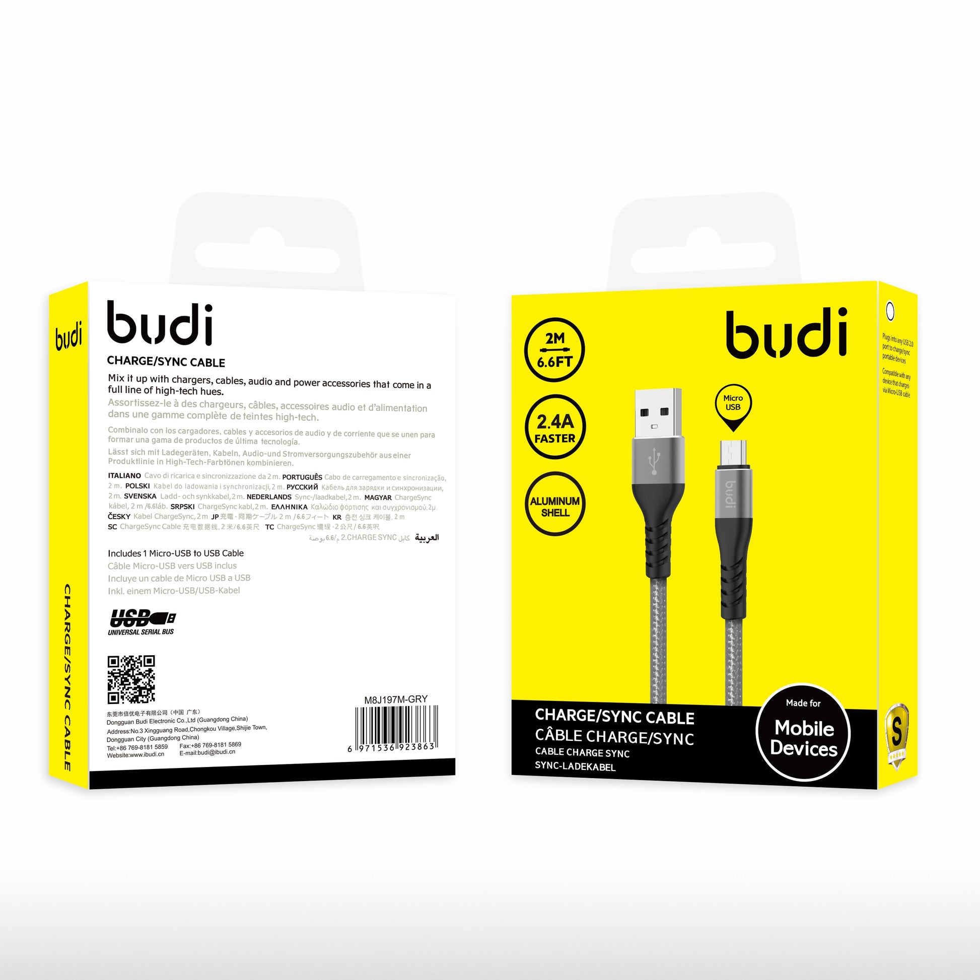 - 1 x Budi 2m (6.6FT) 2.4A Nylon Braided USB to Micro USB Fast Charging Cable with Metal Case - Grey