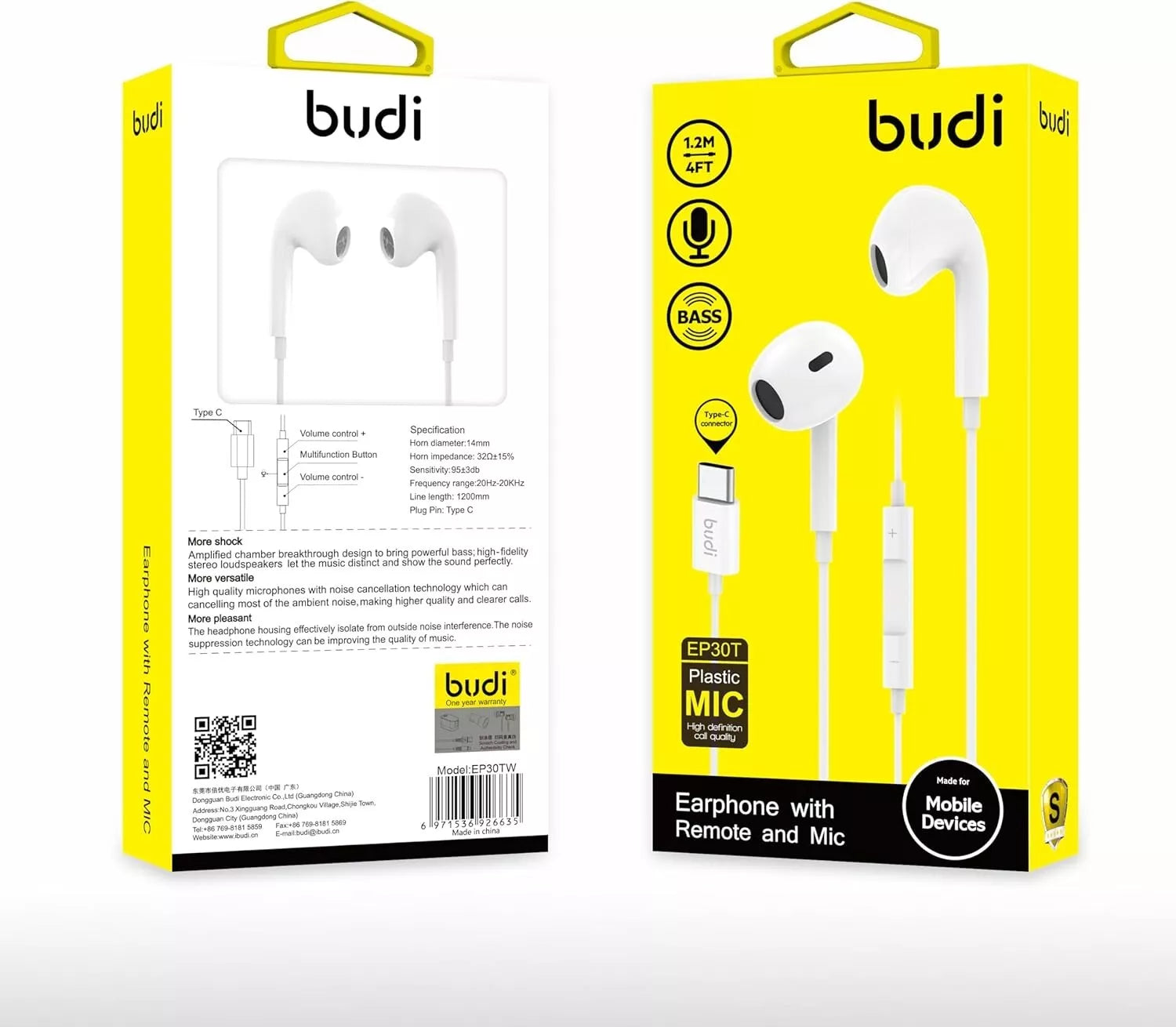 Product Overview: The Budi earphones with remote and mic are designed to provide exceptional sound quality, ergonomic comfort, and ease of use for your USB-C compatible devices. The stylish white design offers a sleek, minimalist look that perfectly complements modern smartphones, tablets, and other devices without a traditional 3.5mm headphone jack.