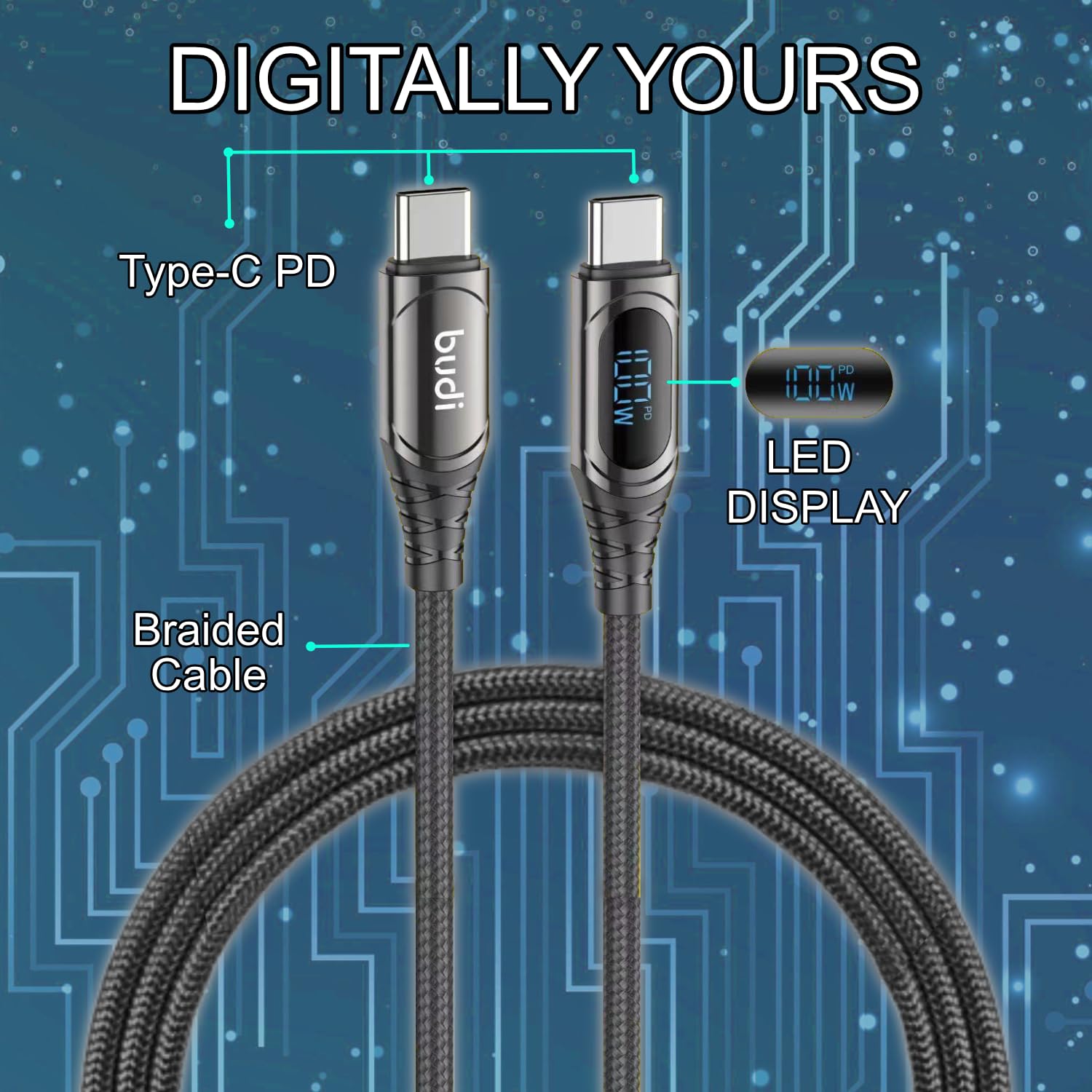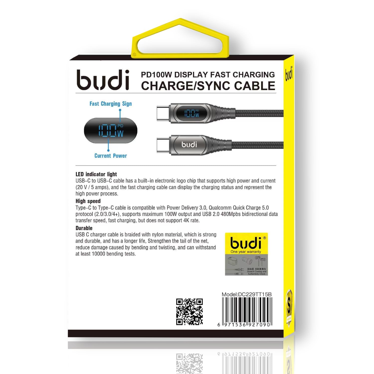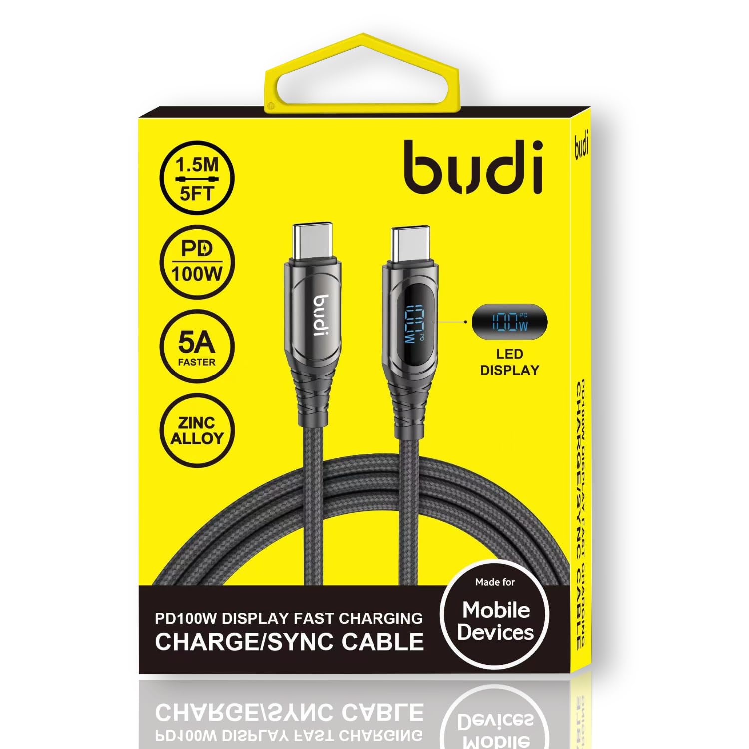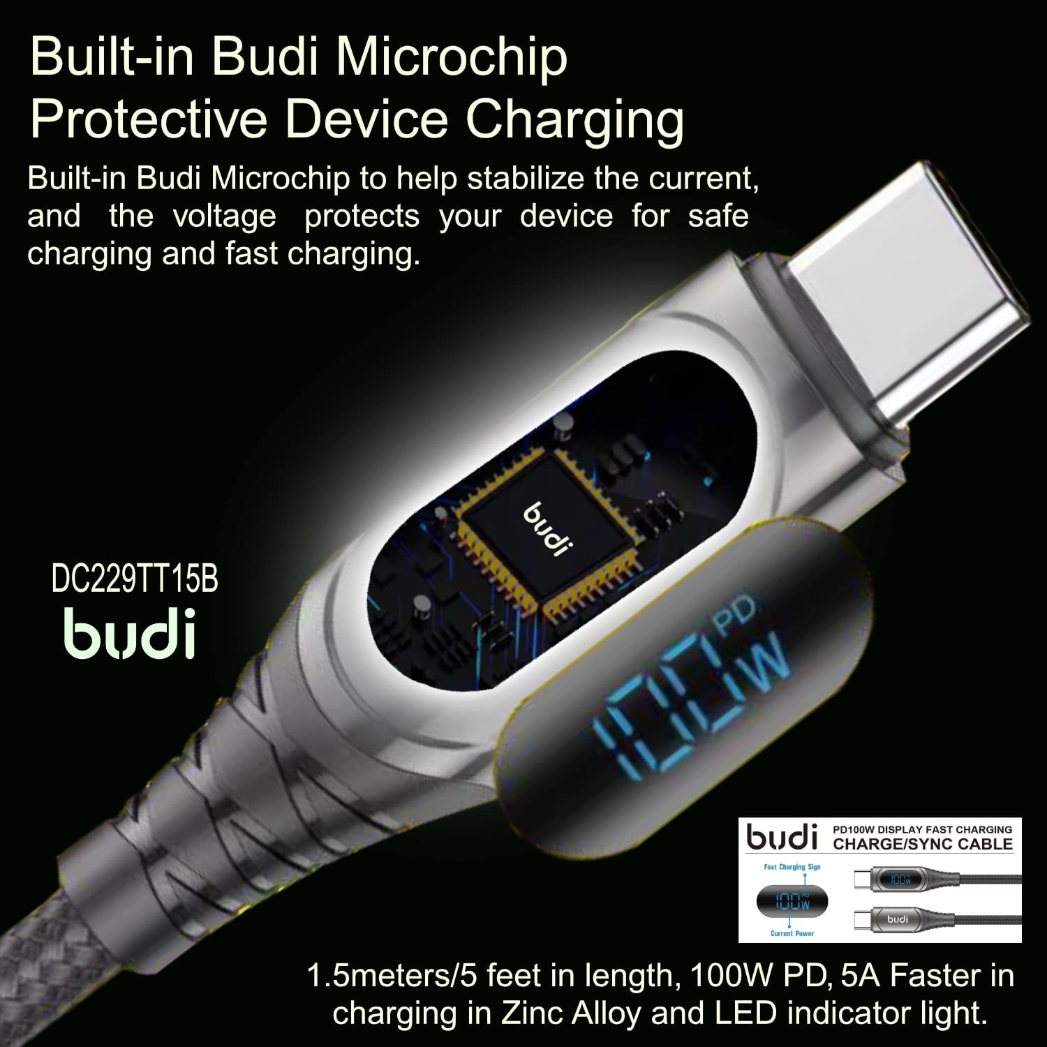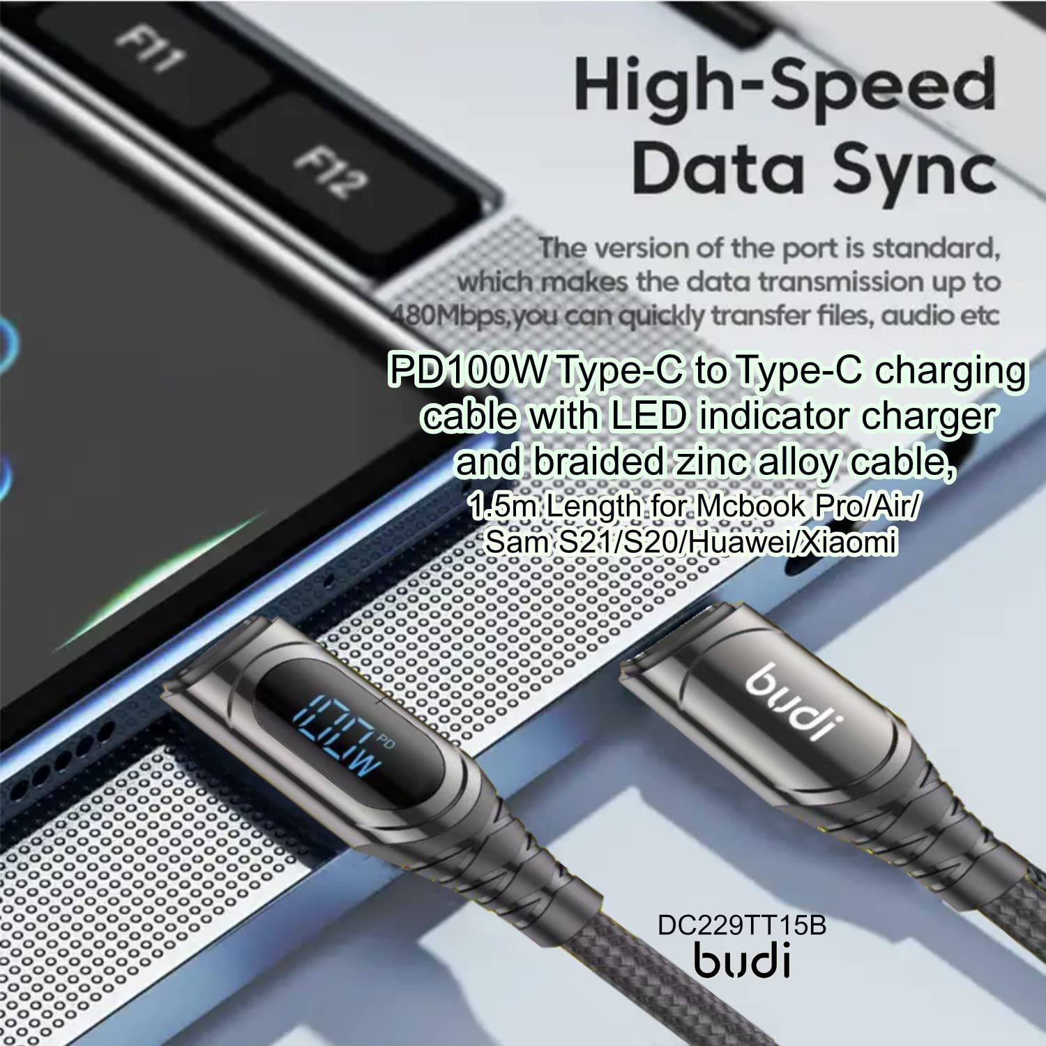 Budi PD100W Type-C to Type-C Charging Cable with LED Indicator and Zinc Alloy Braid, 1.5m for Mac book Pro/Air/Samsung , Huawei/Xiaomi