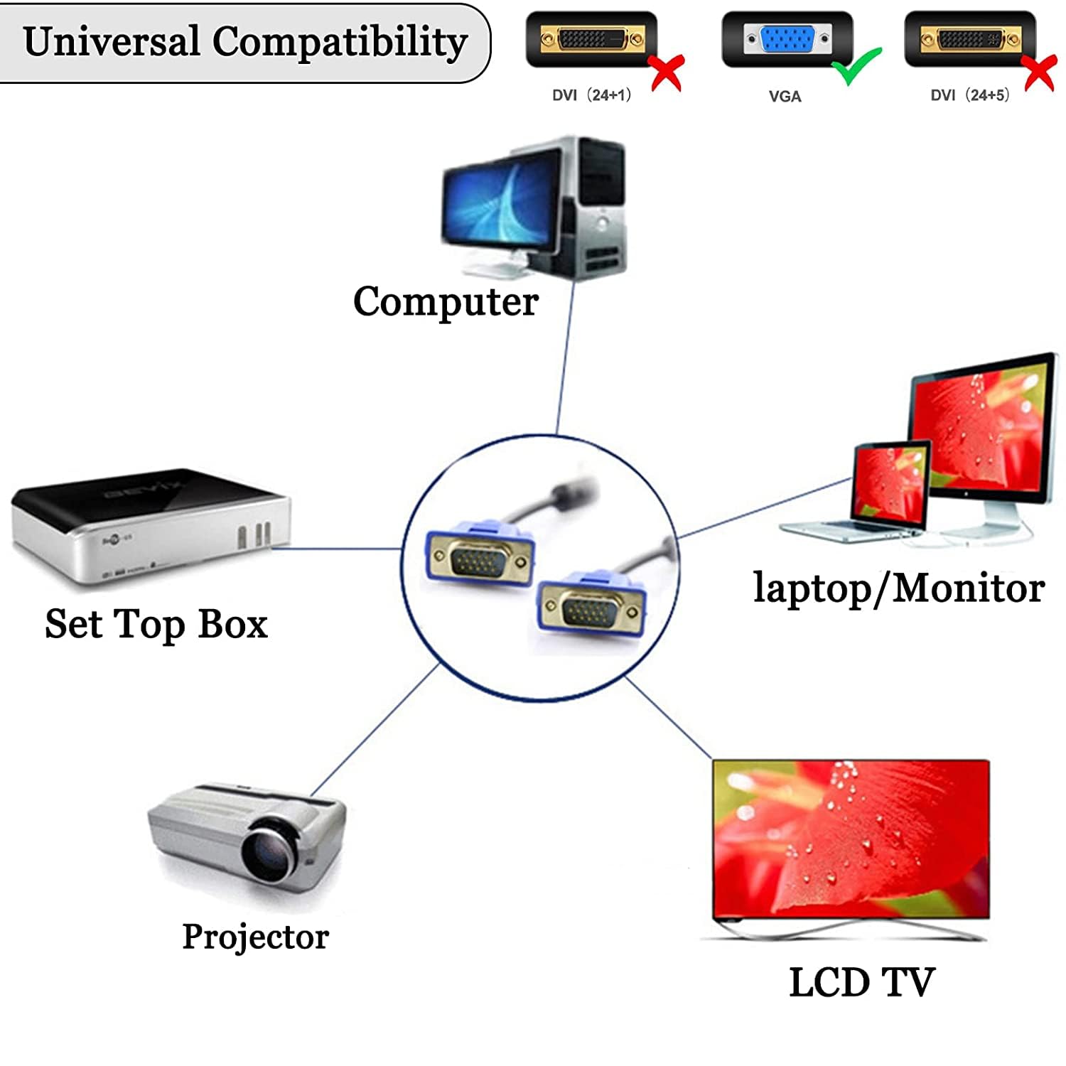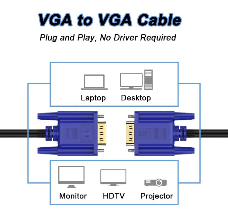 - This VGA cable is compatible with a variety of devices. It can connect laptops, desktops, projectors, monitors, and HDTVs that feature VGA ports. This makes it a versatile solution for both home and office setups.